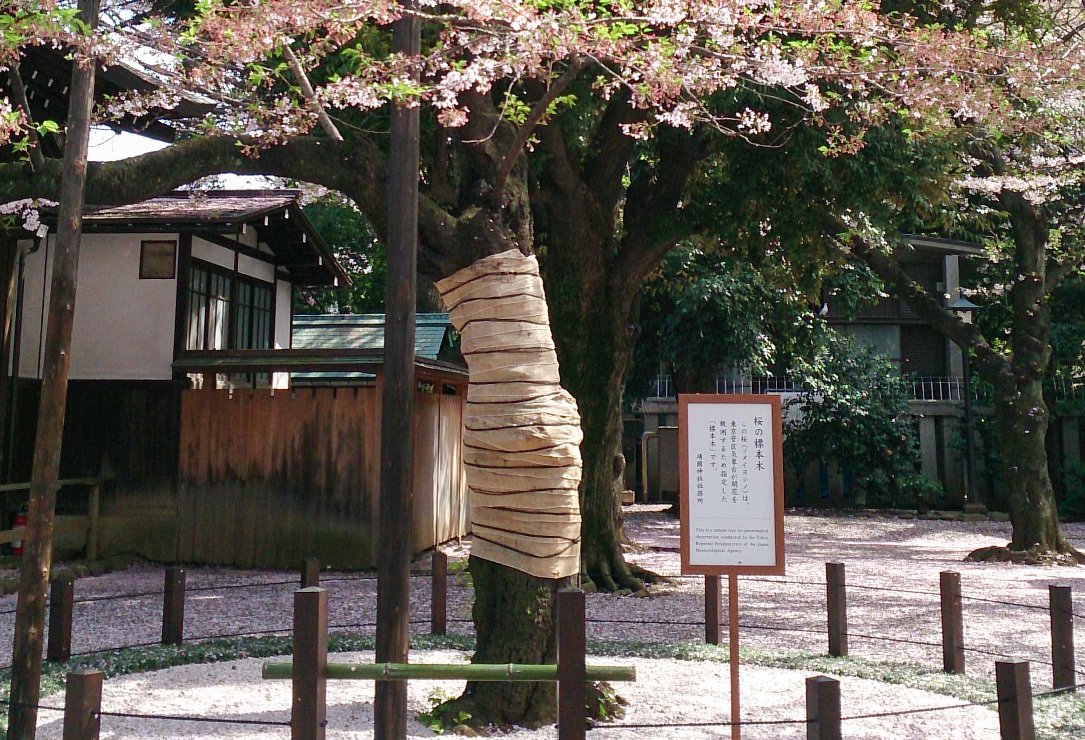 移転して以来、気象庁の敷地内にサクラを持つことができなくなったため、かつての敷地内で観測していたソメイヨシノと同じ時期に開花するソメイヨシノを、靖国神社の中で選んで、それを標本木としました。
